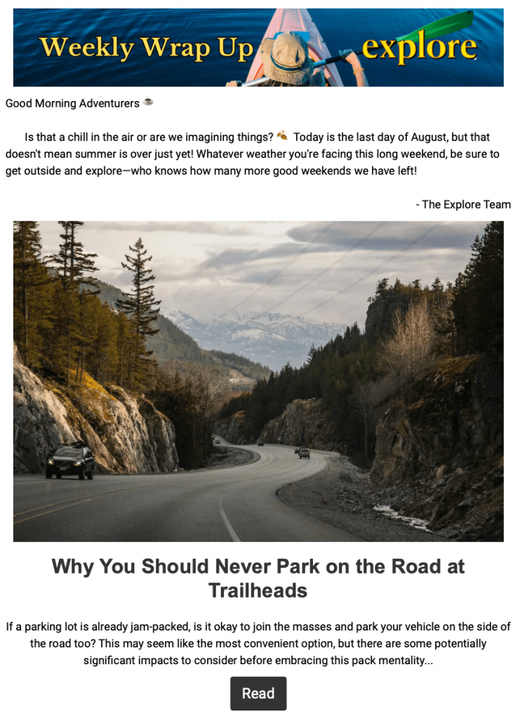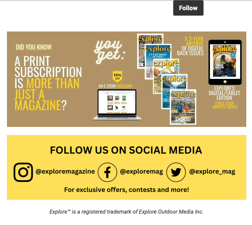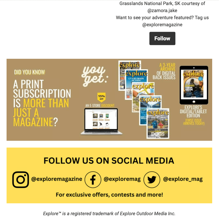 I write, edit and design the graphics within all newsletters sent by Explore Magazine, an example of a more sales focused newsletter here, and more editorial newsletter examples below: